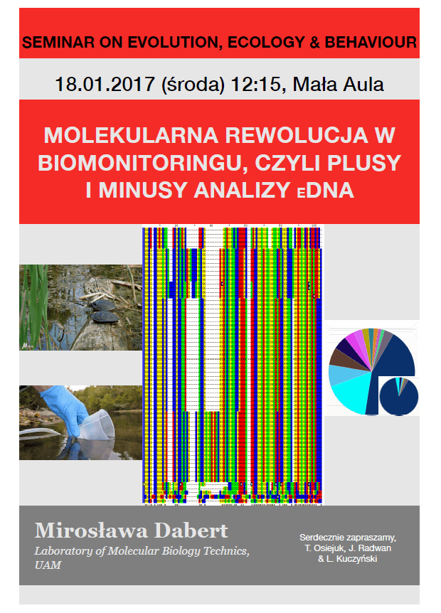 123th SEMINAR ON EVOLUTION, ECOLOGY & BEHAVIOUR: The lecture entitled „Molekularna rewolucja w biomonitoringu, czyli plusy i minusy analizy eDNA” will be given by Mirosława Dabert (Laboratory of Molecular Biology Techniques, AMU, Poznań)